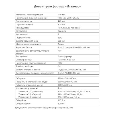 Диван-трансформер Италмас (Аквилон) продается в интернет-магазине mebel-online-nizhnevartovsk.ru по цене 73 376 руб. Есть доставка по Нижневартовску и Ханты-Мансийскому автономному округу. Возможность подъема на этаж и сборки уточняйте у менеджера по телефону 8(800)505-27-11.